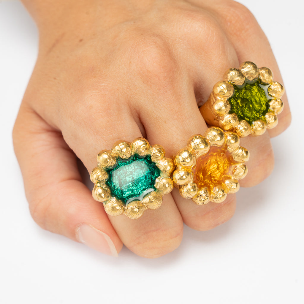 con resina epoxi verde, azul y ámbar.